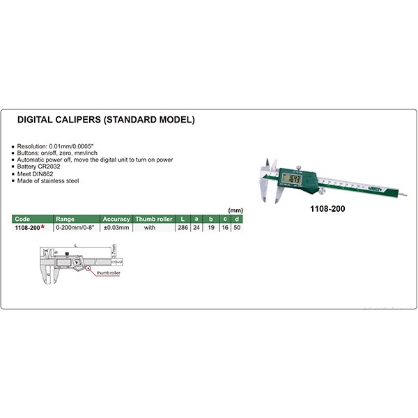 caliper Precision Measuring Made Easy with the Insize Digital Caliper When precision is paramount, the Insize Digital Caliper is your trusty companion. Engineered with excellence and precision in mind, this digital caliper is the tool of choice for professionals and hobbyists alike. With a range of 0 to 200 mm (0 to 8 inches) and a resolution of 0.01 mm (0.0005 inches), it ensures that your measurements are consistently accurate. Key Features: Precision at Your Fingertips The Insize Digital Caliper boasts an array of features that simplify the measuring process. Its clear digital display provides measurements in both millimeters and inches, ensuring versatility for any project. The zero button allows you to reset the measurement for differential readings with ease. Designed for Convenience Never worry about draining the battery unnecessarily - the Insize Digital Caliper comes equipped with an automatic power-off function. When you're not using it, simply move the digital unit, and it will turn off automatically, conserving power and prolonging battery life. Speaking of the battery, it uses a CR2032, a widely available and easy-to-replace power source. Built to Last Constructed with precision and durability in mind, the Insize Digital Caliper is made of stainless steel. This not only ensures its longevity but also adds an extra layer of protection against rust and corrosion, making it suitable for a wide range of environments. Compliant with Standards The Insize Digital Caliper meets the DIN862 standard, guaranteeing the highest level of precision and quality. Whether you're working on industrial projects or precision crafting, you can trust this caliper to deliver accurate and reliable measurements every time. Model: 1108-200, Insize The Insize Digital Caliper, model 1108-200, is your reliable measuring companion, designed and manufactured by Insize, a trusted name in precision measuring instruments. Insize's Digital Caliper is the perfect tool for a wide range of applications, from machining and carpentry to quality control and research. Trust in its precision, durability, and ease of use to ensure that your measurements are consistently accurate. Whether you're a professional engineer or a passionate DIY enthusiast, the Insize Digital Caliper is your ticket to precision measuring made easy. Order yours today and experience the difference it can make in your projects. |